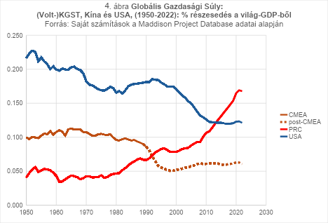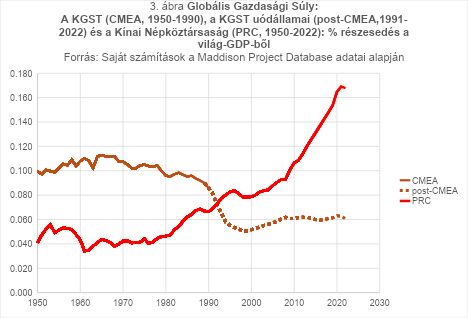A KGST (az ábrában, angol rövidítéssel: „CMEA”) 1964-ben érte el globális gazdasági súlyának csúcsát – ekkor a globális termék 11,3%-át adta. 1968 után a KGST eleinte viszonylag enyhe visszaesést tapasztalt, majd 1978 után valamivel meredekebben kezdett lecsúszni. A szovjetközpontú „tömb” feloszlásakor a KGST mindössze 8,6%-kal járult hozzá a világtermékhez. Globális értelemben sem a súlygyarapodás, sem pedig fogyás nem volt különösebben lélegzetelállító; a szocialista blokk pályája hol enyhén emelkedő, hol kicsit kevésbé finoman leereszkedő – félperifériás államok csoportjához hasonlított. A világra, a világgazdaság és világpolitikai szabályaira gyakorolt potenciális, kollektív befolyásuk csökkenését meglehetősen jól jelzi, hogy a KGST 1991-es feloszlatásával a korábbi tagállamok a bruttó világtermék a KGST-ként regisztrált 8,6%-ról átlagosan 0,8%-os globális gazdaság súlyú, mégoly „szabadon” lebegő”, ám annál jelentéktelenebb szereplőkké váltak. Az Oroszországi Föderációnak – az egykori KGST legsúlyosabb tagállamának – világ-GDP-beli részesedése 3,5%-ra csökkent. A KGST, a Szovjetunió, Jugoszlávia és Csehszlovákia gyors egymásutánban történő felbomlása együttesen összesen huszonkilenc, formális értelemben posztállamszocialista, új tőkés államot-államocskát hozott létre. A belépés valamely egyéb, „nagytérgazdálkodást” szolgáló integrációs rendszerbe – itt, konkrétan, a kelet-(közép-)európai társadalmak számára egyértelműen: az EU-ba – élet-halál kérdésévé vált.