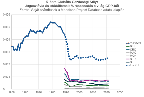 A posztállamszocialista gazdaságok látványos súlyvesztésének második és harmadik jelensége a kisállami-etatista nacionalizmusok korai, könnyű győzelméhez kapcsolódott Kelet-(Közép-)Európa és Észak-Eurázsia három szövetségi államában. Jugoszlávia nem kevesebb, mint öt felbomlási háborúban hét új, pro forma független államra hullott szét. 1990-ben Jugoszlávia (lásd az 5. ábrát) a világ bruttó termékének 0,4%-át birtokolta. Utódállamai együttes globális gazdasági súlyának[5]