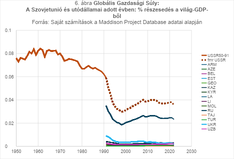 Nem könnyű feladat a globális gazdasági súly posztszovjet dinamikáját egyetlen grafikonon ábrázolni (lásd a 6. ábrát). A Szovjetunió vége óta tartó időszakban ugyanis csak két utódállamot – az Oroszországi Föderációt és Ukrajnát – lehet vizuálisan megkülönböztetni a fennmaradó tizenhárom új államot jelző vonalaktól. Utolsó évében a Szovjetunió a világ bruttó termékének körülbelül 3%-át tette ki.