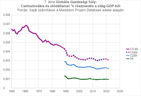 Az égő szemű egykori szovjet és egykori jugoszláv nemzetszurkolókhoz hasonlóan a cseh és szlovák elitek is elérkezettnek vélték az időt, hogy megpróbálkozzanak nemzeti egyedüllétre vonatkozó álmaik megvalósításával. Ennek folyamatát a nyugati főáram – a közhelyek kiapadhatatlan kútforrása – „bársonyos válásnak” nevezte el. Csehszlovákia 1961-ben volt (lásd a 7. ábrát) világgazdasági teljesítményének csúcsán, 0,68%-kal. A válás utáni hanyatlás a térség többi szétszakadt országához képest enyhe mértékű volt. A hasadás előtti Csehszlovákia a világ bruttó termékének 0,43%-át tette ki; ezután a szétválás után tizenöt évvel EU-taggá vált, a két utódállam együttes részesedése 0,3% körüli értékre csökkent.