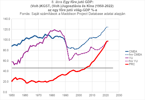 A 8. ábra az egykori államszocialista társadalmak jövedelmének alakulását mutatja, a mindenkori világátlag százalékában, az 1989-90-es töréspont előtt és után. Nézzük elsőként a Kölcsönös Gazdasági Segítség Tanácsa (KGST, az ábrában, angol rövidítéssel: „CMEA”, illetve „fmr-CMEA”) egészének, illetve a rendszerváltás után egykori tagországainak teljesítményét Jugoszlávia (az ábrában: „YU” illetve „fmr-YU”) és a Kínai Népköztársaság (az ábrában: „PRC”) teljesítményével összevetve.[8]