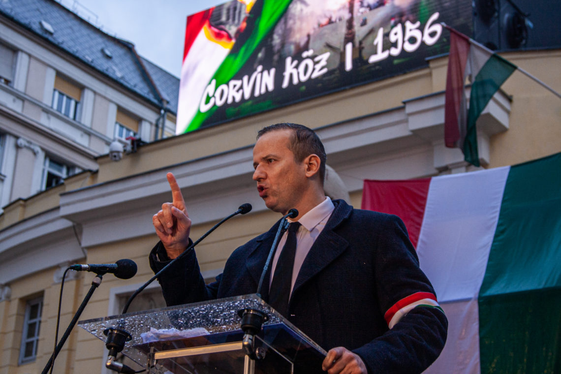A Mi Hazánk a Corvin közben, az 1956-os ellenállás ikonikus helyszínén tartotta megemlékezését. A megjelentek itt sem maradtak showelemek nélkül: a párt szokás szerint hozott magával egy ágyút a megemlékezésre, amit háromszor el is sütöttek.
