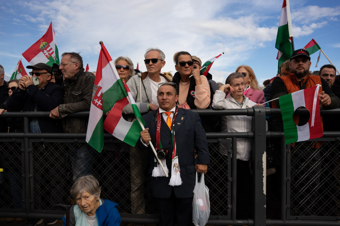 Magyar Péter pártelnök a Hősök terén egy egyszerű pódiumon emelkedett a nép elé – szemben Orbán Viktor könnyűszerkezetes, VIP-részleggel ellátott diadalívével. Magyar „a nép embere” imidzséhez passzolva felett lökhajtásos vadászgépek sem húztak trikolórcsíkot az égre.