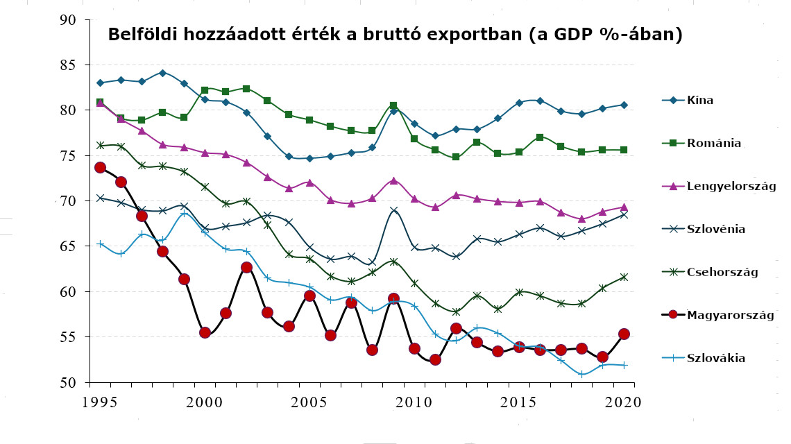A magyar tulajdonú vállalatok globális értékláncokba való érdemi bekapcsolódási képessége továbbra is rendkívül alacsony. Ahogyan a 2. ábra mutatja, Magyarország bruttó exportjának hazai hozzáadottérték-tartalma nem javult, és az OECD-országok között továbbra is az egyik legalacsonyabb, ami a növekedési modell kimerülését jelzi.[11]