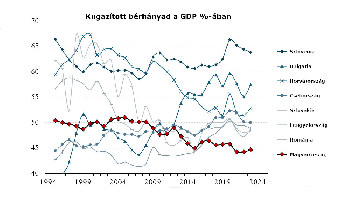 Ugyanakkor még az orbánizmus úgymond „aranykorszakában” is a reálbérek csak viszonylag visszafogott ütemben nőttek, stratégiailag a regionális bérnövekedési szint alatt tartva. Magyarország volt az egyetlen ország a térségben, ahol a bérek GDP-n belüli aránya tovább csökkent a 2010-es években, elsősorban a reálbérek tudatos visszafogása miatt, ahogyan azt az 1. ábra is mutatja.[4]