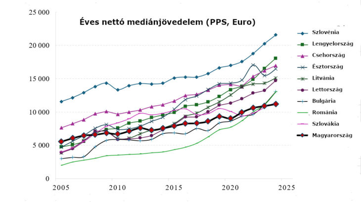 Ahogyan a 3. ábra mutatja: míg Magyarország korábban a harmadik legmagasabb egy főre eső medián reáljövedelemmel rendelkezett a tíz keleti uniós tagállam között, 2024-re a legalacsonyabb pozícióba csúszott vissza, ami közvetlen következménye Orbán tudatos bérvisszafogó stratégiájának.[16]